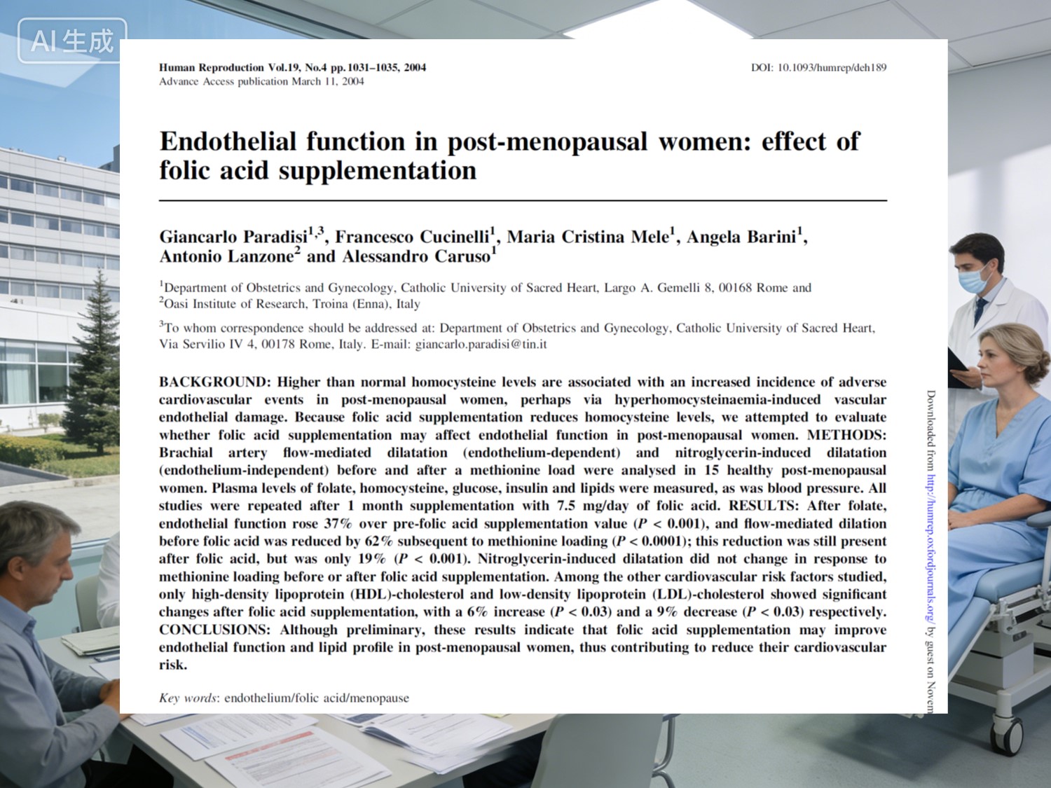 A 2004-cü ildə nəşr olunan əlamətdar araşdırma İnsan çoxalması (Əgər 6.1) tərəfindən Giancarlo Paradisi, Francesco Cucinelli və həmkarları xüsusi diqqət yetirdilər postmenopozal qadınlar. Tipik nümayəndəsi olan on beş sağlam iştirakçı postmenopozal vəziyyət, 7,5 aldı mg/gün bir ay ərzində fol turşusu. Nəticələr nəzərəçarpacaq təkmilləşdirmələr göstərdi: