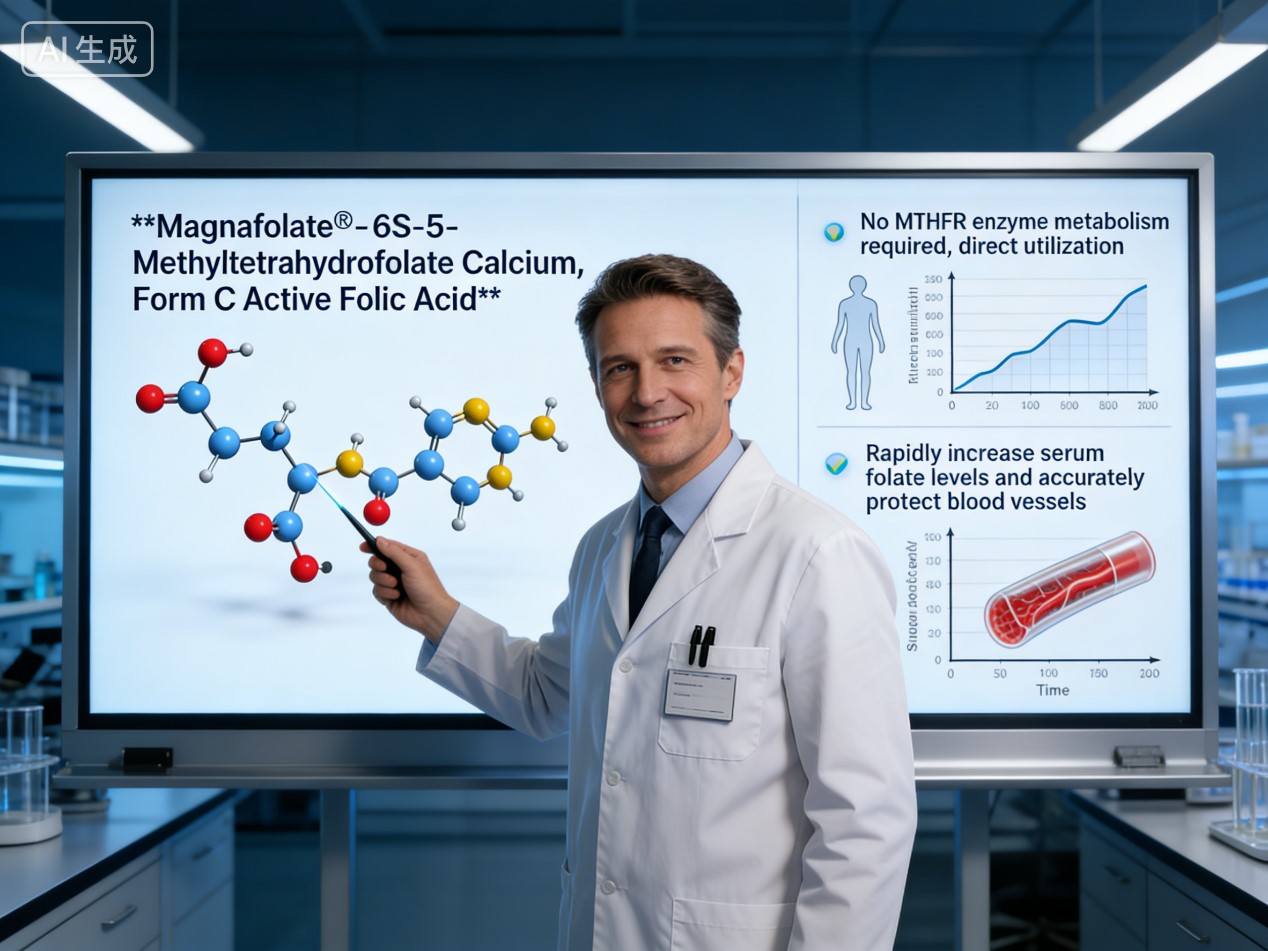Magnafolate®, a 6S-5-metiltetrahidrofolat kalsium (Kristal Aktiv Folat), buna cavab verir əsas klinik ehtiyac. Təbiətcə aktiv folat kimi, tələb edir MTHFR fermenti yoxdur maddələr mübadiləsi və dərhal istifadəyə hazır bədənə daxil olur, bunu təmizləmək üçün HCY parçalanma yoluna sürətlə qoşulun“səssiz aşındırıcı”gəmilərin. Serum folatını sürətlə yüksəldir səviyyələri, vaxtında, məqsədyönlü damar qorunmasına mükəmməl uyğun gəlir postmenopozal enzimatik dəyişikliklər, bununla da aradan qaldırılır“tamamlayır, lakin udmur”problem.