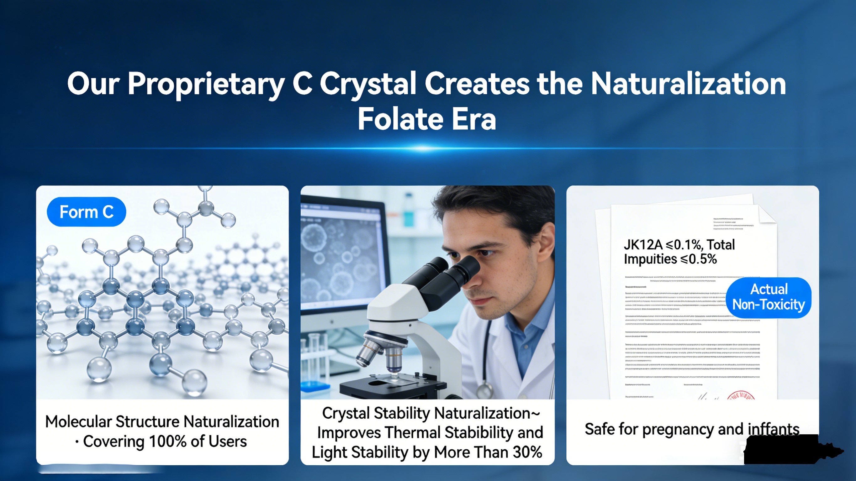 Mülkiyyət C-Crystal Naturalization Folat: Qlobal patentlimiz aktiv folatın kristal forması və dünyada ilk Naturalizasiya folatı kateqoriya. Təhlükəsizlik qidadan əldə edilən fol turşusuna yaxınlaşır. Sabit qalır otaq temperaturu və hamiləlik-uşaq dərəcəli keyfiyyət nəzarətlərinə cavab verir yerli və beynəlxalq farmakopiyalar. Ən son yeniləməni təmsil edir folat texnologiyası.