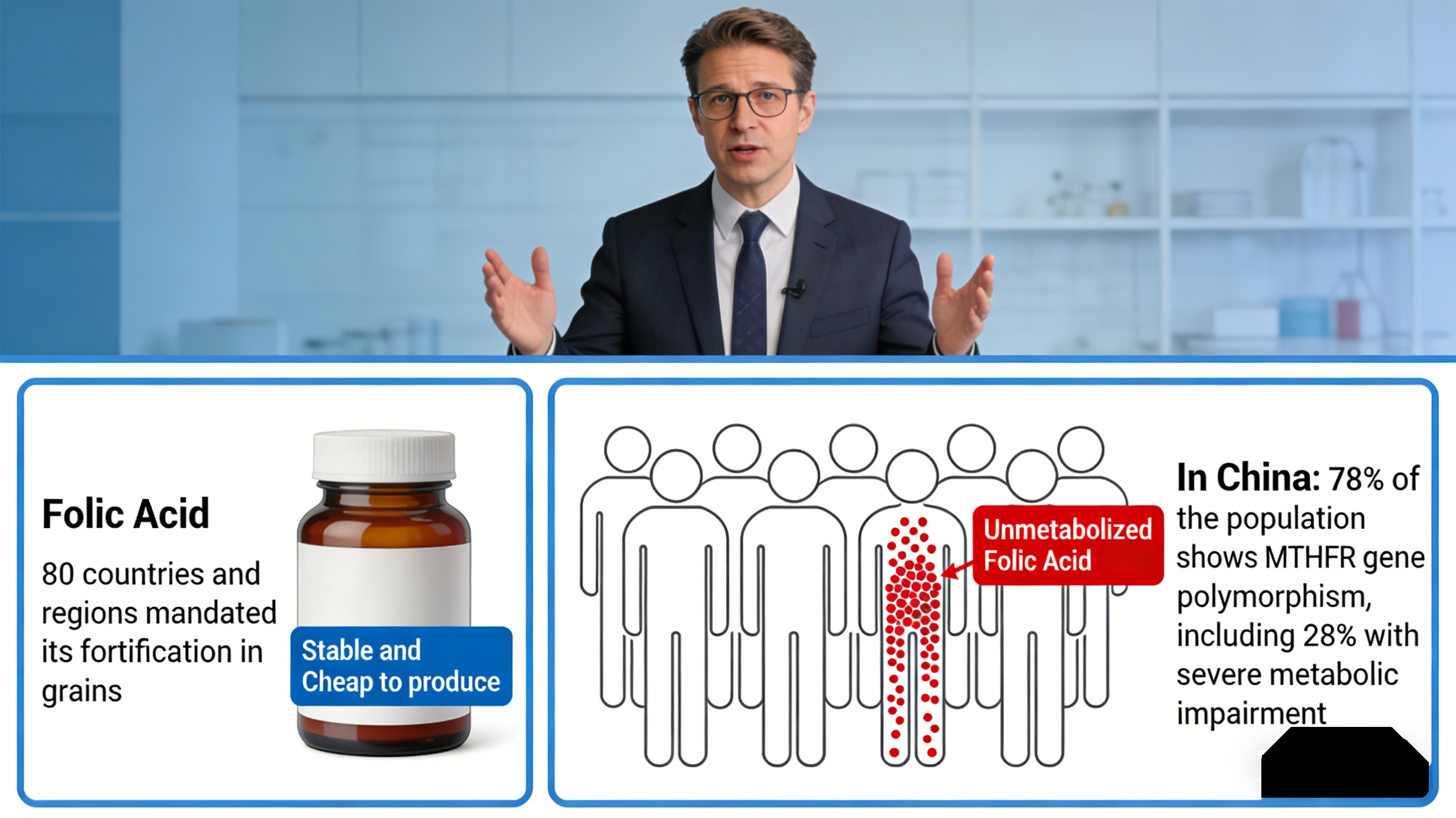 Praktiki baxımdan Çinlilərin təxminən 30%-i fol turşusunu effektiv şəkildə çevirə bilmir, bu da səmərəsiz əlavələrə səbəb olur və B12 vitamini çatışmazlığını maskalaya bilən metabolizə olunmamış fol turşusunun potensial yığılması və sinkin udulmasına mane olur. Şirkətlər üçün bu, çevrilir istehlakçı şikayətləri və reputasiya riski.