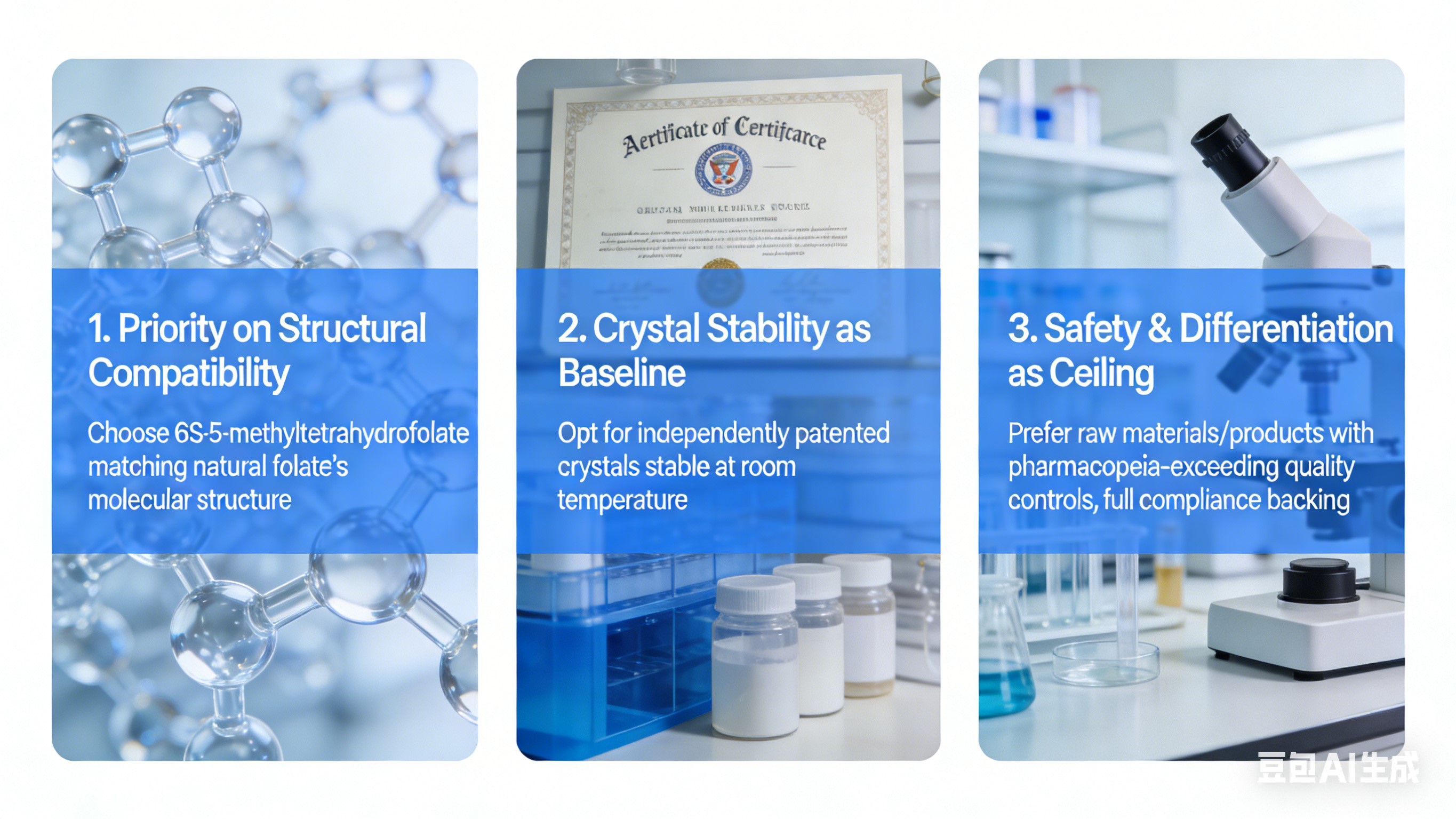 1. Struktur uyğunluğu üzrə prioritet: 6S-5-metiltetrahidrofolat uyğunluğunu seçin təbii folatın molekulyar quruluşu - birbaşa udma, hamısını əhatə edir istifadəçilər, təsirsizliyin qarşısını alır.2. Əsas kimi kristal sabitlik: Müstəqil olaraq patentləşdirilmiş stabil kristallara üstünlük verin partiyanın tutarlılığını və etiket iddiasını təmin etmək üçün otaq temperaturunda uyğunluq.