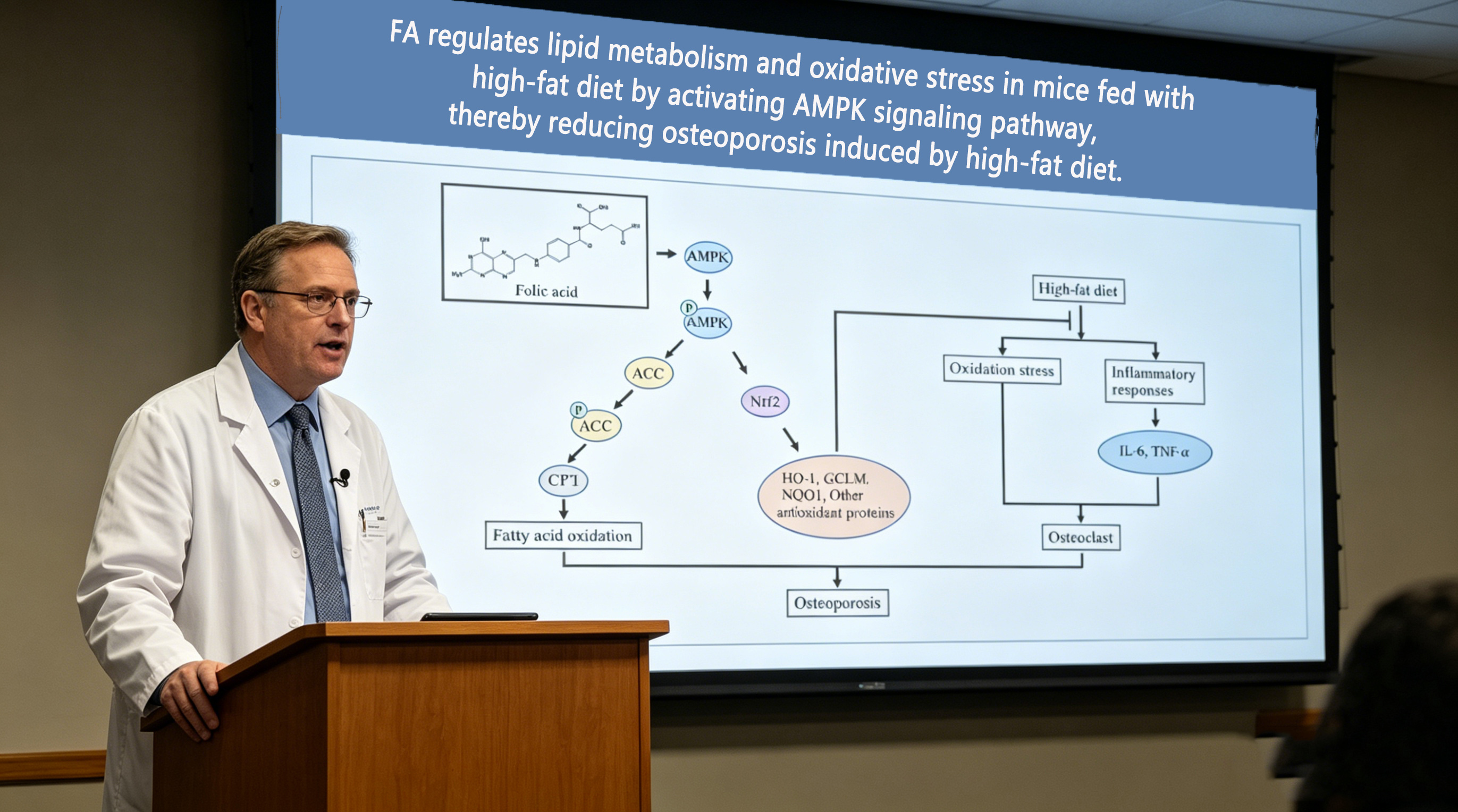 Fol turşusu AMPK-nı aktivləşdirir → CPT1 vasitəsilə lipid mübadiləsini normallaşdırır → Nrf2 vasitəsilə antioksidant qabiliyyətini artırır → metabolik mühiti yaxşılaşdırır → sümükləri qoruyur.