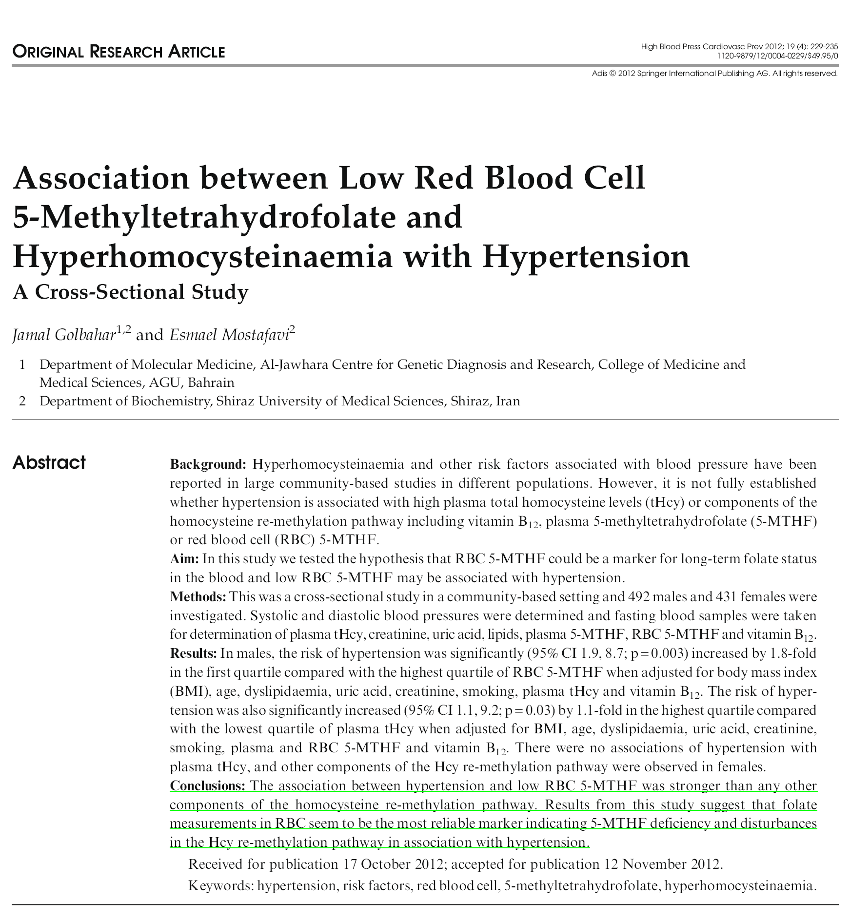 [1] Aşağı qırmızı qan hüceyrəsi 5-metiltetrahidrofolat və hipertoniya ilə hiperhomosisteinemiya arasında assosiasiya. *Yüksək qan təzyiqi və ürək-damar xəstəliklərinin qarşısının alınması*, 2012.
